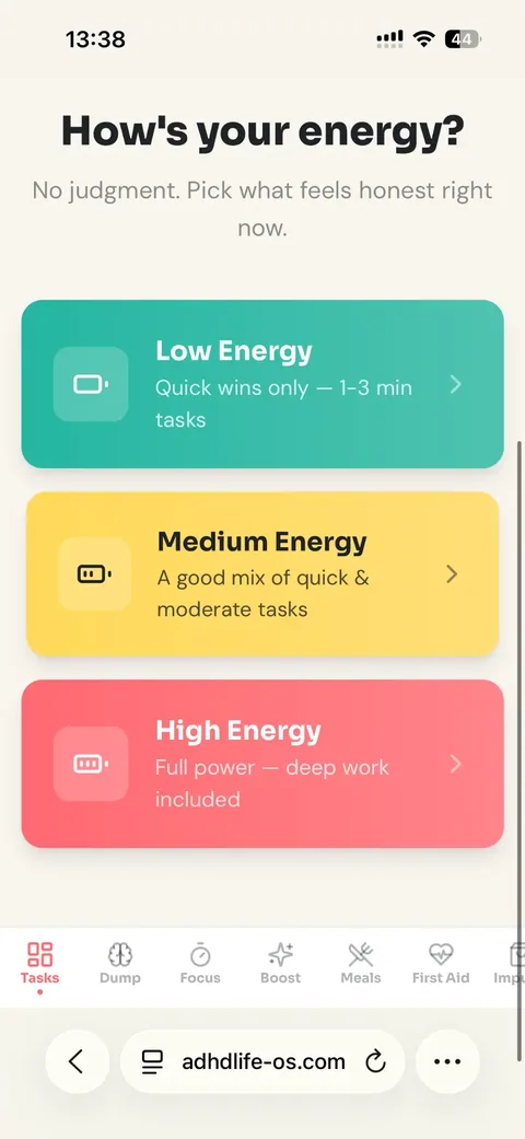 A web app that turns your overloaded brain into one doable next step — matched to the energy you actually have today. Open in your browser. First task in 60 seconds.